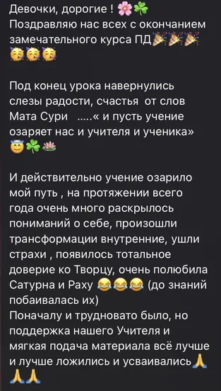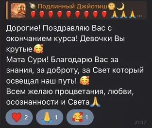 По завершении двенадцатимесячной программы появляется устойчивый навык чтения карты. Карта читается целостно, глубоко и последовательно, без разрозненных правил. Возникает способность разбирать любую карту и делать ясный вывод по сферам жизни. По желанию появляется возможность консультировать других. Джйотиш становится инструментом, который сопровождает всю жизнь: для понимания причин, для видения сроков, для выбора верного шага.