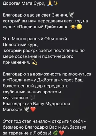 Подлинный Джйотиш представлен как авторская школа Маты Сури. Программа и учебные материалы принадлежат школе и защищены авторским правом. Материалы курса остаются внутри школы. При этом навык, язык и понимание, которые формируются в процессе обучения, остаются у ученика и служат ему в личной практике и в работе с людьми.